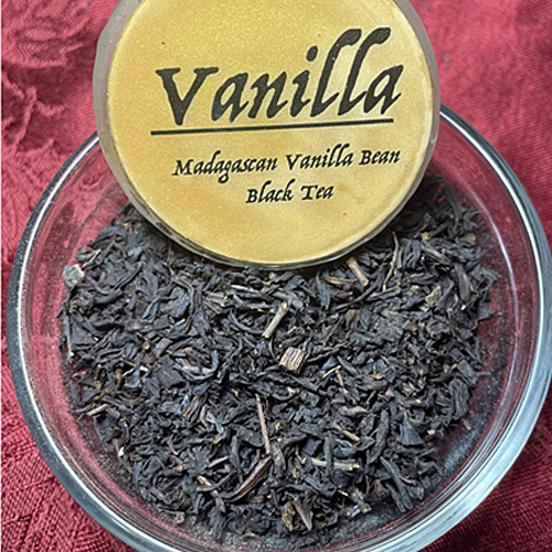 A soft vanilla, tastes great with any dessert. Cut up Madagascan Vanilla Beans and Black Tea.